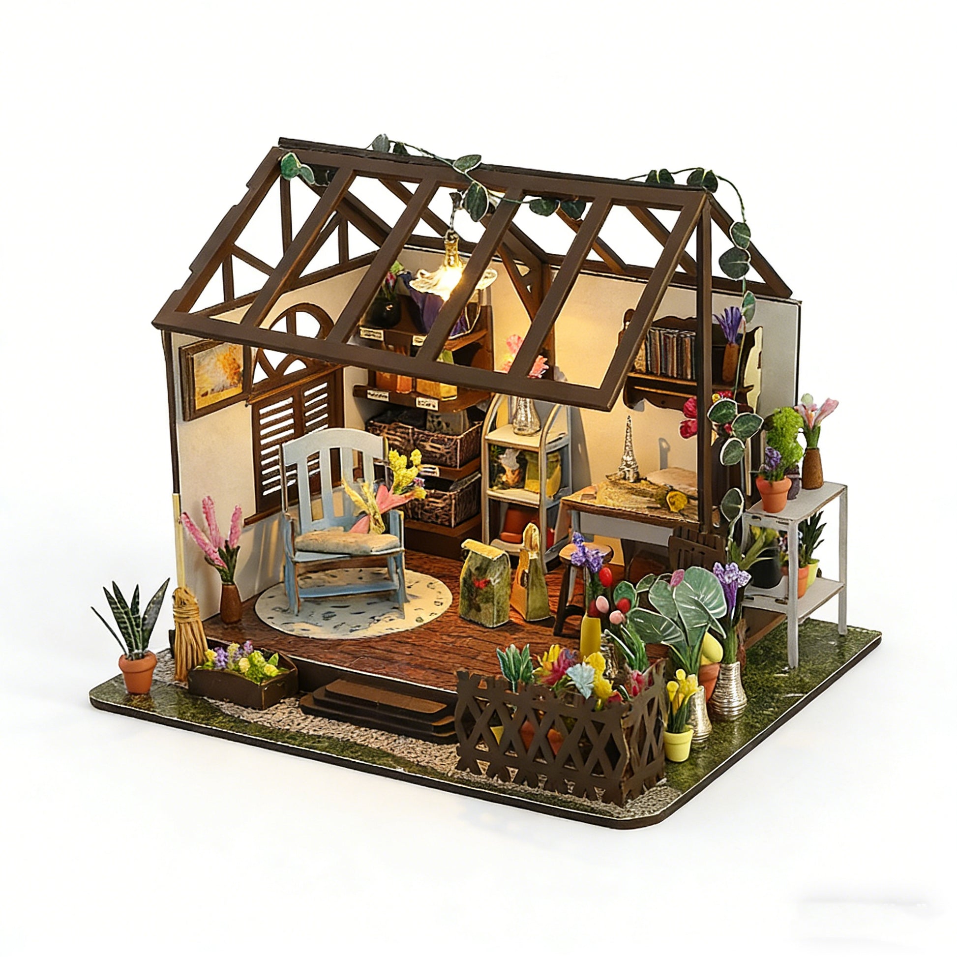 DIY Miniature Greenhouse Craft Kit - Wooden Plant-Themed Dollhouse Buildable Model with LED Lighting, Cozy Decorative Desktop Display for Hobbyists & Relaxation Enthusiasts